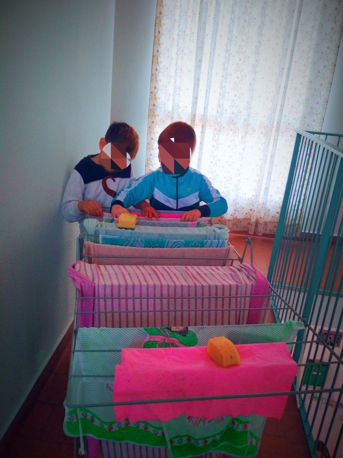 En este caso, dos niños de 7 años quisieron ayudar a su educadora a tender las toallas y a aprender cómo poner la lavadora para colaborar en sus casas con sus familias.