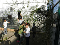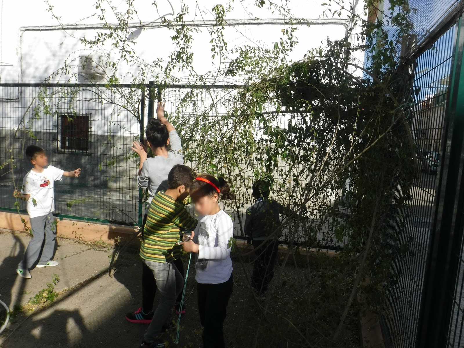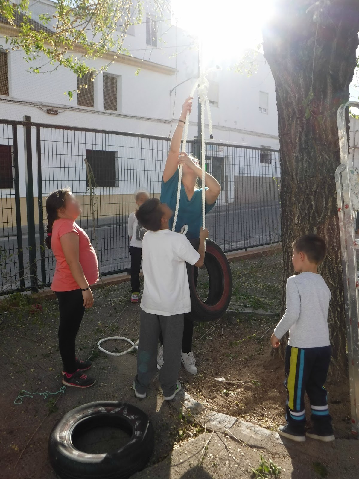 En primer lugar, la seño ayudada por nuestro vecino Manuel, el cual se ofreció voluntariamente, podaron las ramas de los árboles que estaban muy largas y podían ser peligrosas. Con ellas nos pasamos la tarde construyendo una cabaña muy chula. ¡Aquí no se desperdicia nada! Con la zona despejada y la colaboración de todos, colocamos una cuerda enganchada a un árbol para escalarlo y, en el otro árbol, un columpio hecho con cuerda y una rueda.