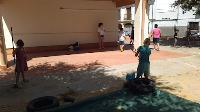 Por ello, cada tarde al llegar, nos ponemos manos a la obra con nuestras escobas y limpiamos cada hoja y cada pizquito de globo que está en el suelo. Una vez que tenemos todo recogido, ya si que podemos jugar a gusto en nuestro arenero, con globos de agua o con lo que nos apetezca ¡pasamos las tardes muy divertidas.