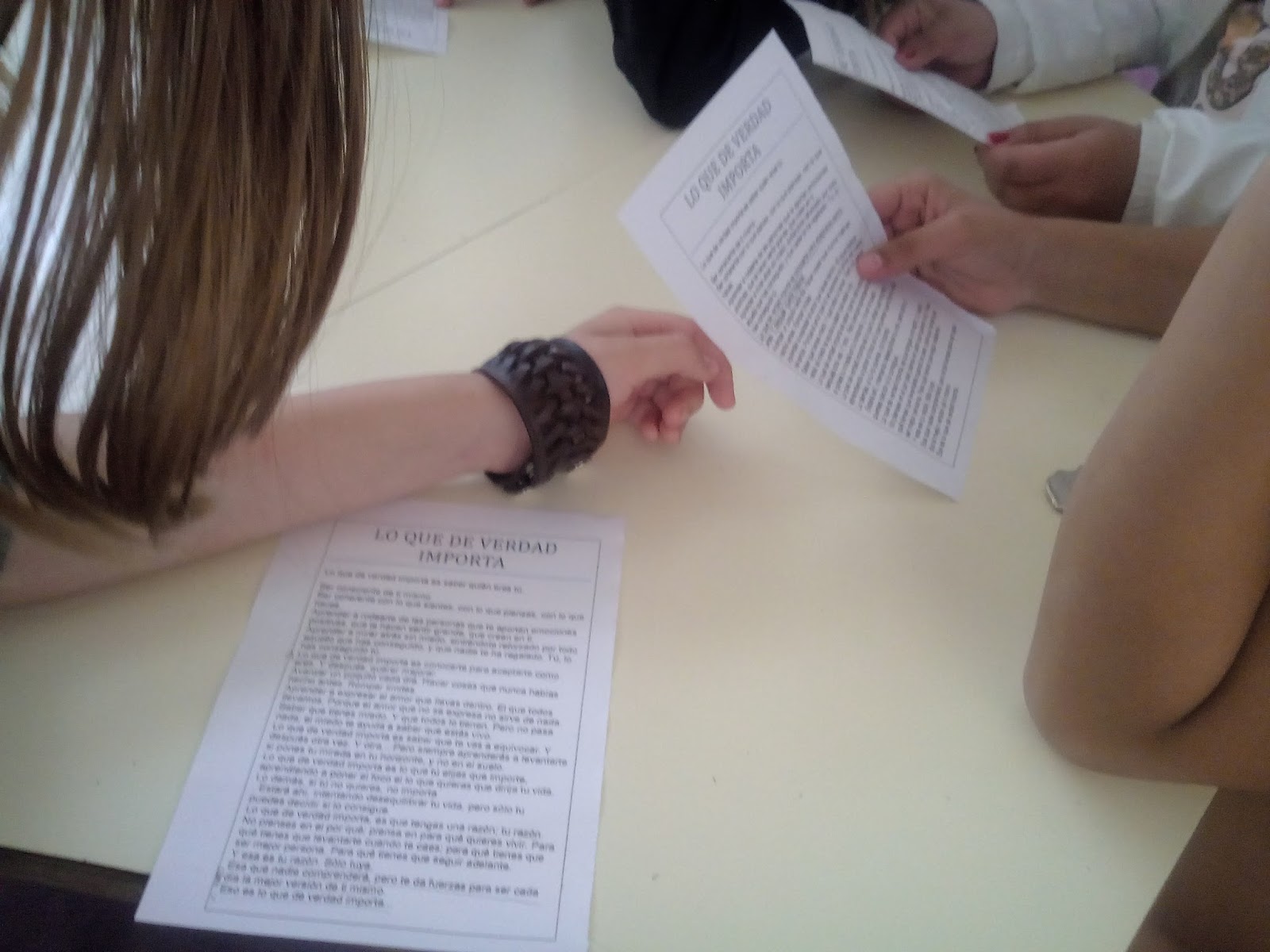 Hoy en las Buenas tardes, los mayores hemos leído un texto que se llama “Lo que de verdad importa”. En él aparecían frases motivadores, bonitas y de esas que te hacen pensar sobre ti y tu vida como por ejemplo: Lo que de verdad importa es conocerte para aceptarte como eres. Y después, querer mejorar. Avanzar un poquito cada día. Hacer cosas que nunca habías hecho antes. Romper límites. Lo que hicimos fue leer entre todos el texto, elegir cada uno alguna frase que le gustara especialmente y compartir con los compañeros el por qué habíamos elegido la frase.